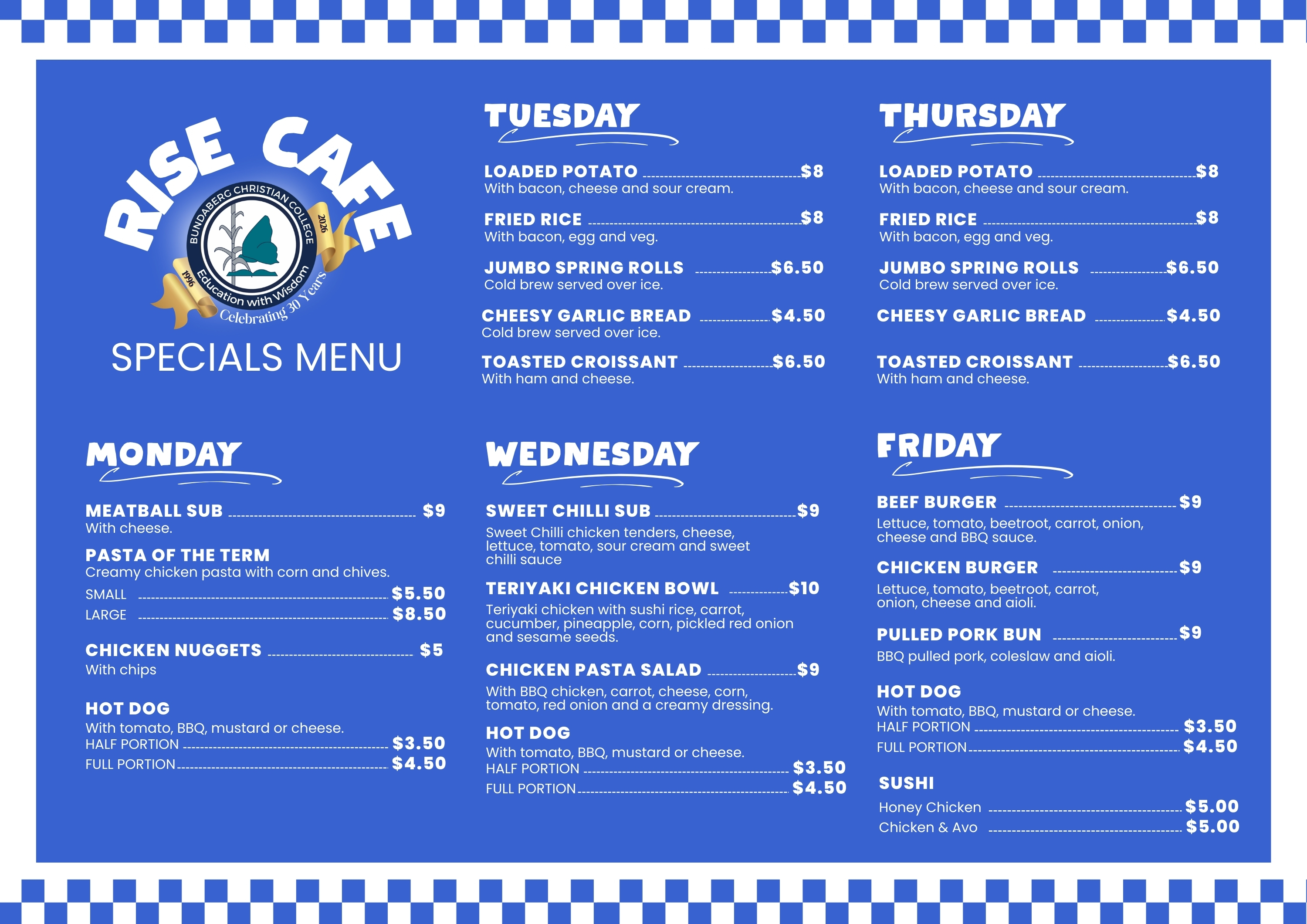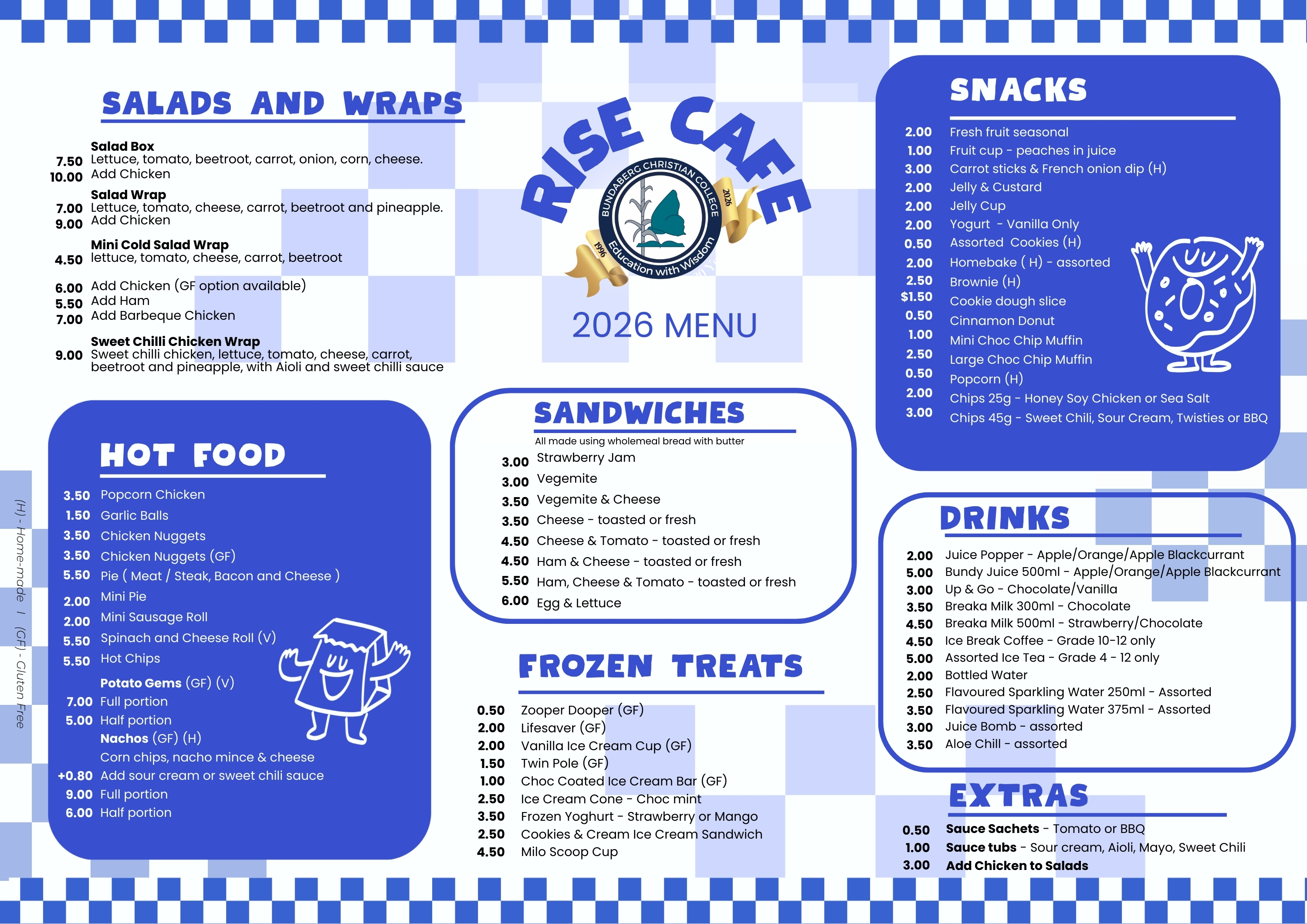 Rise Café offers online ordering through FlexiSchools. You can click on this link “How to order online through FlexiSchools” to follow a step by step guide to register using FlexiSchools. Note that ordering cut off time is 8am from Monday to Friday during school term.